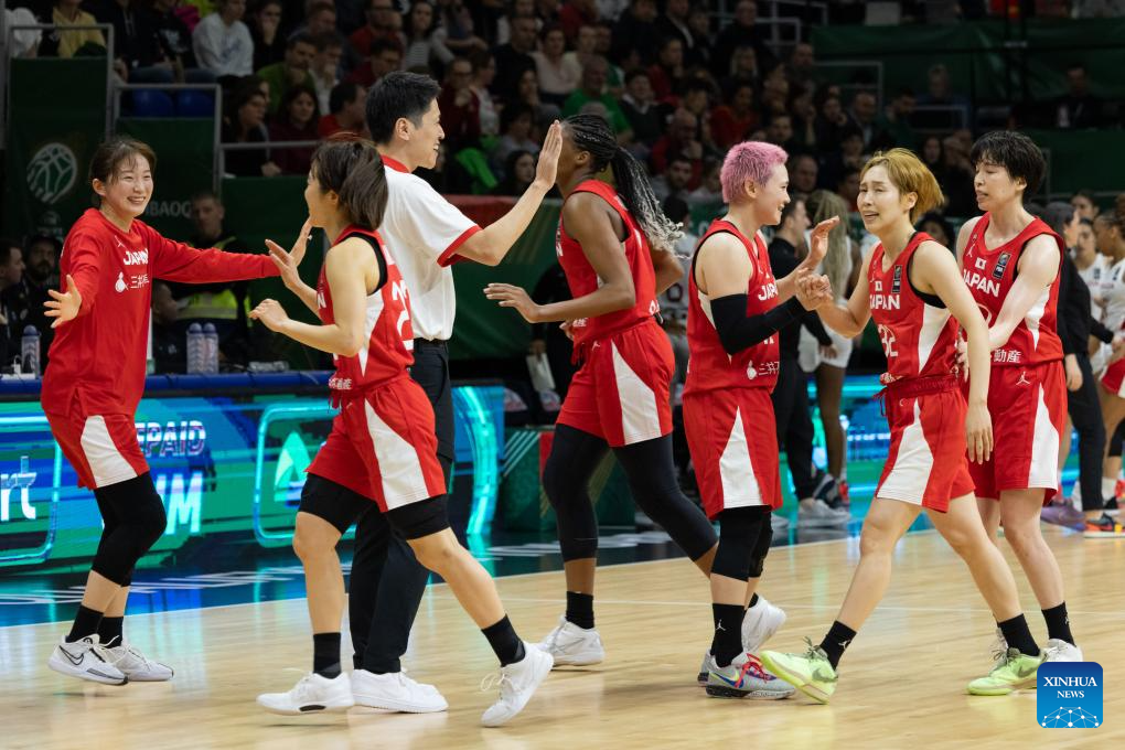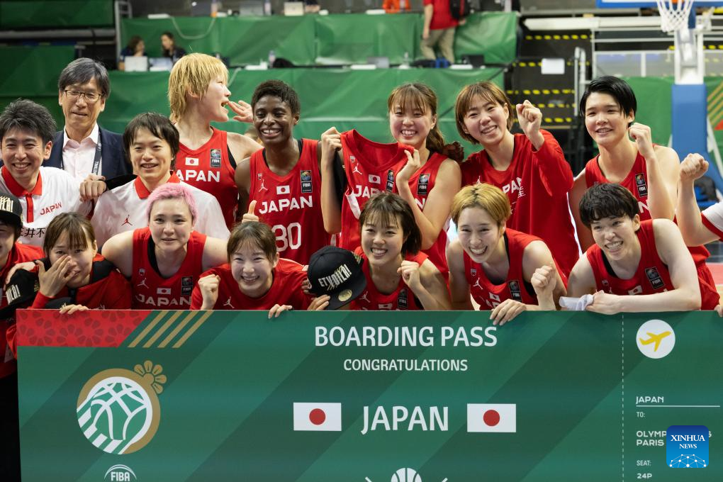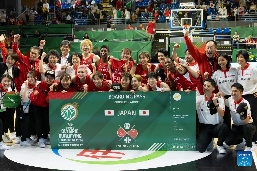 Members of team Japan react after winning the match between Canada and Japan at the FIBA Women's Olympic qualifying tournament in Sopron, Hungary on Feb. 11, 2024. (Photo by Attila Volgyi/Xinhua)
