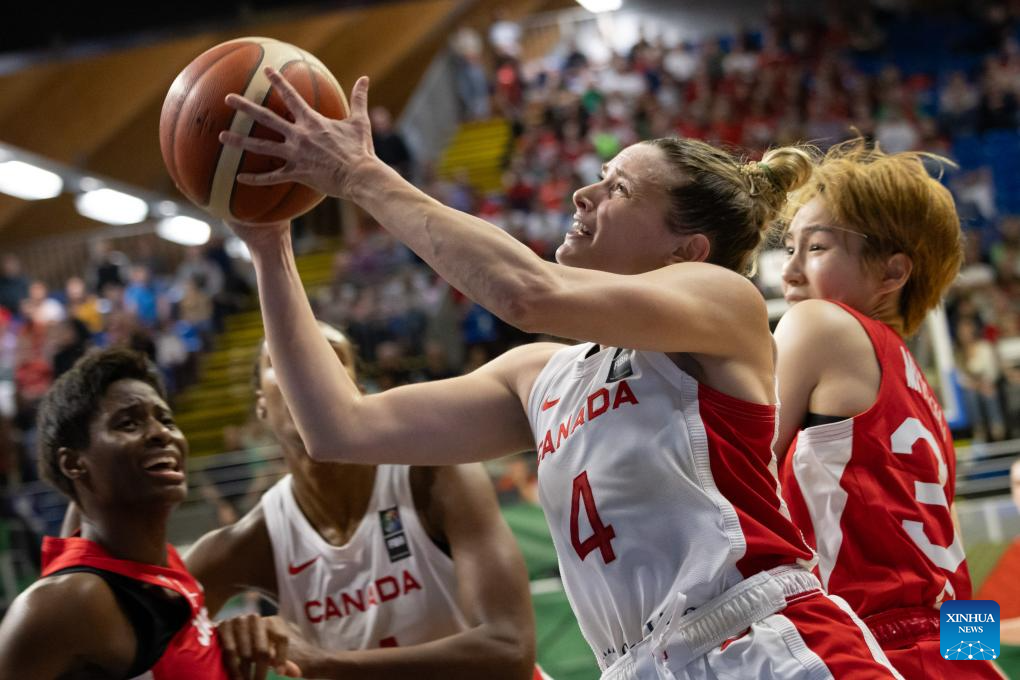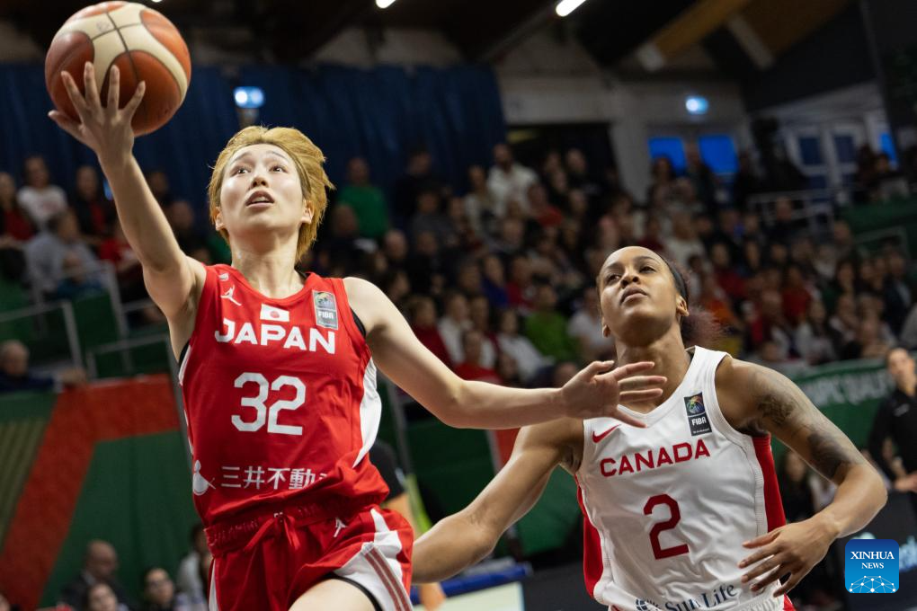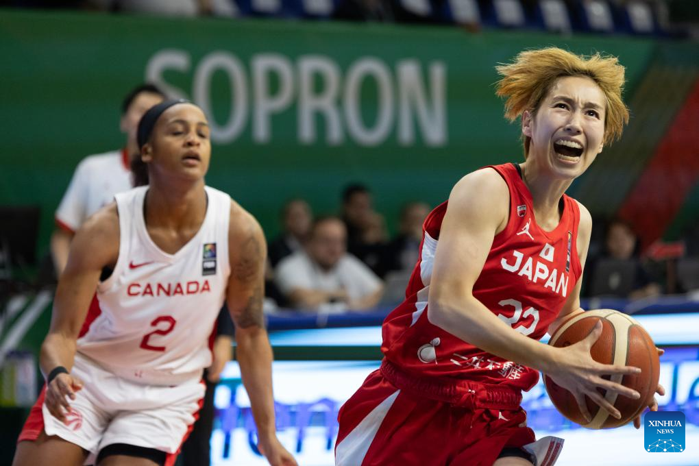 Sami Hill (2nd R) of Canada goes to basket during the match between Canada and Japan at the FIBA Women's Olympic qualifying tournament in Sopron, Hungary on Feb. 11, 2024. (Photo by Attila Volgyi/Xinhua)