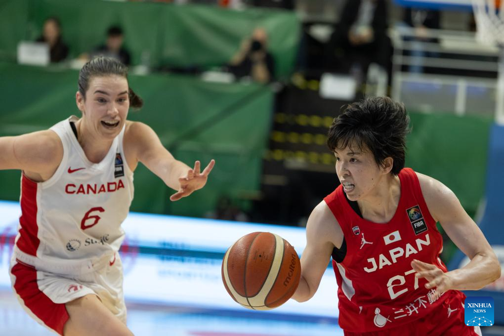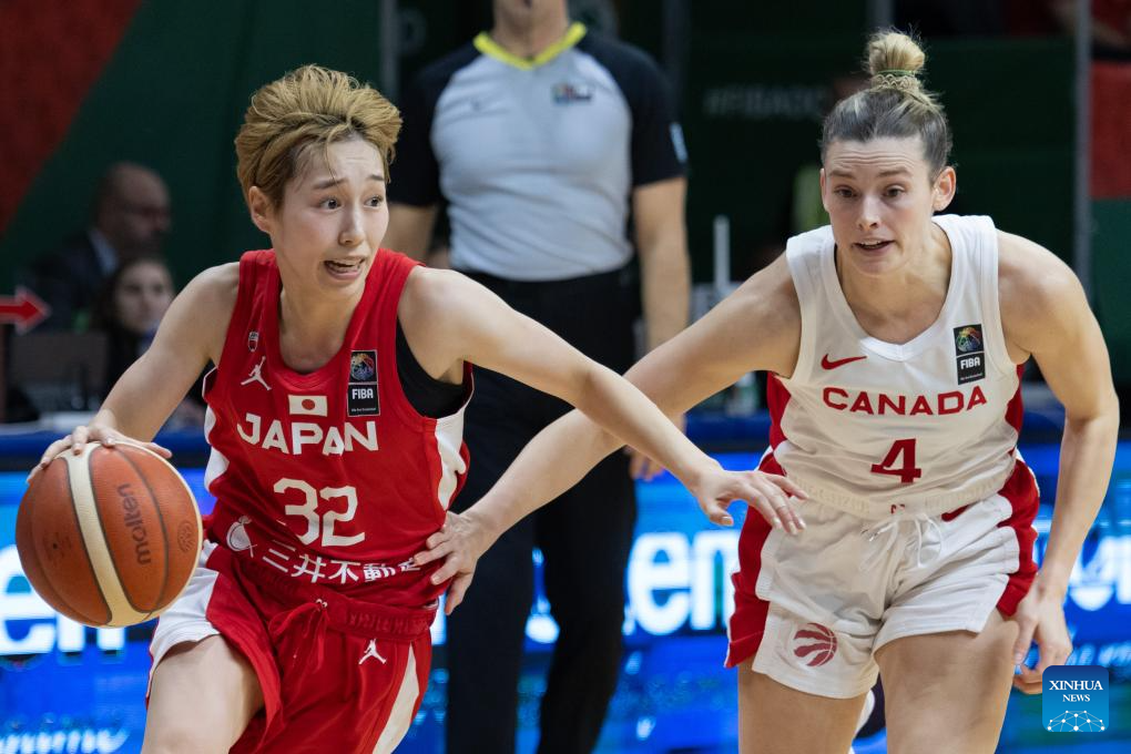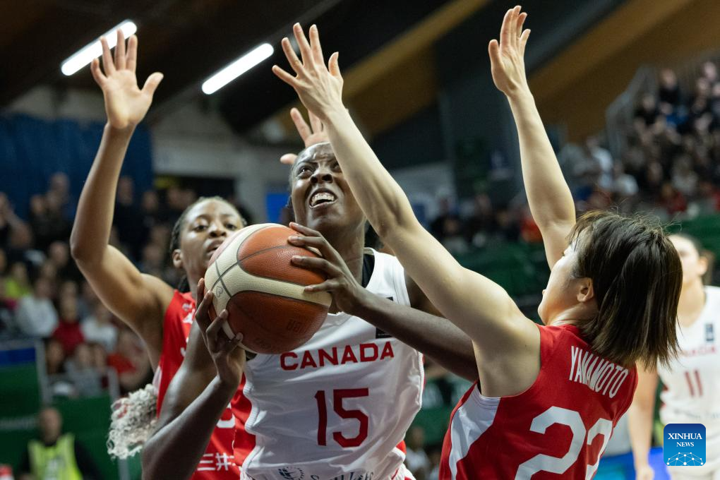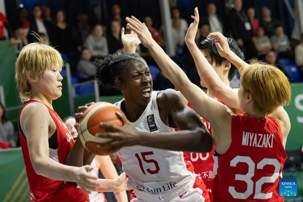 Laeticia Amihere (C) of Canada competes during the match between Canada and Japan at the FIBA Women's Olympic qualifying tournament in Sopron, Hungary on Feb. 11, 2024. (Photo by Attila Volgyi/Xinhua)