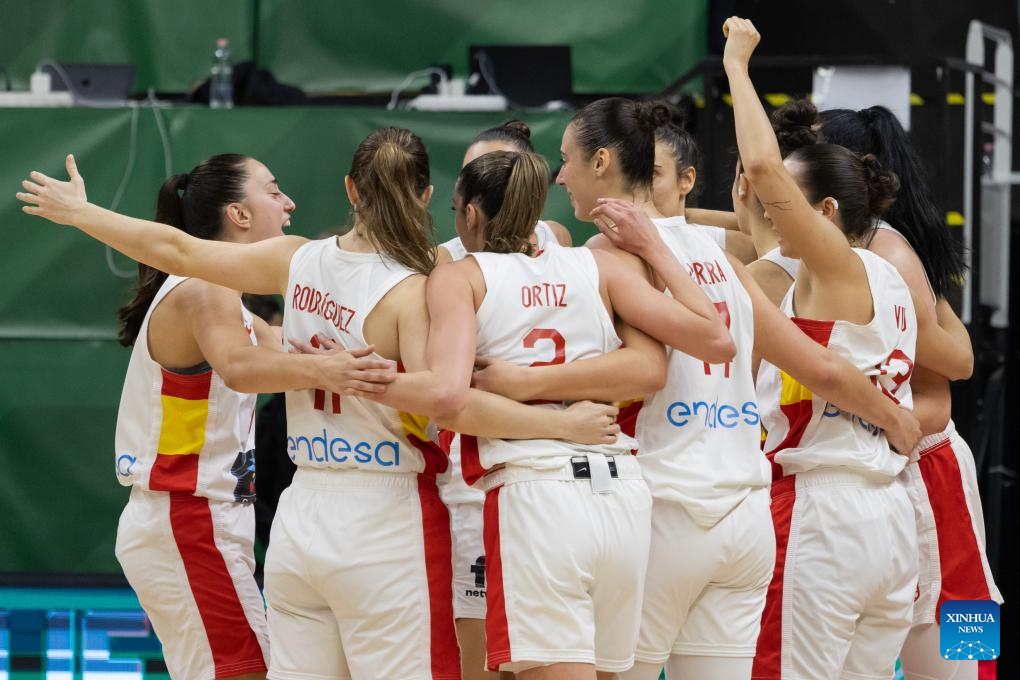 Members of team Spain celebrate after winning the match between Spain and Hungary at the FIBA Women's Olympic qualifying tournament in Sopron, Hungary on Feb. 11, 2024. (Photo by Attila Volgyi/Xinhua)