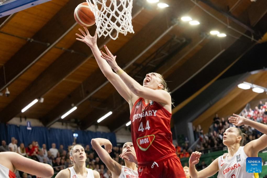 Queralt Casas (L) of Spain goes for a lay-up during the match between Spain and Hungary at the FIBA Women's Olympic qualifying tournament in Sopron, Hungary on Feb. 11, 2024. (Photo by Attila Volgyi/Xinhua)