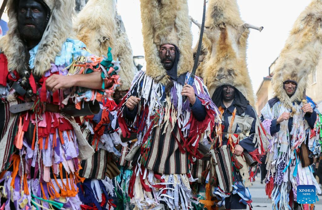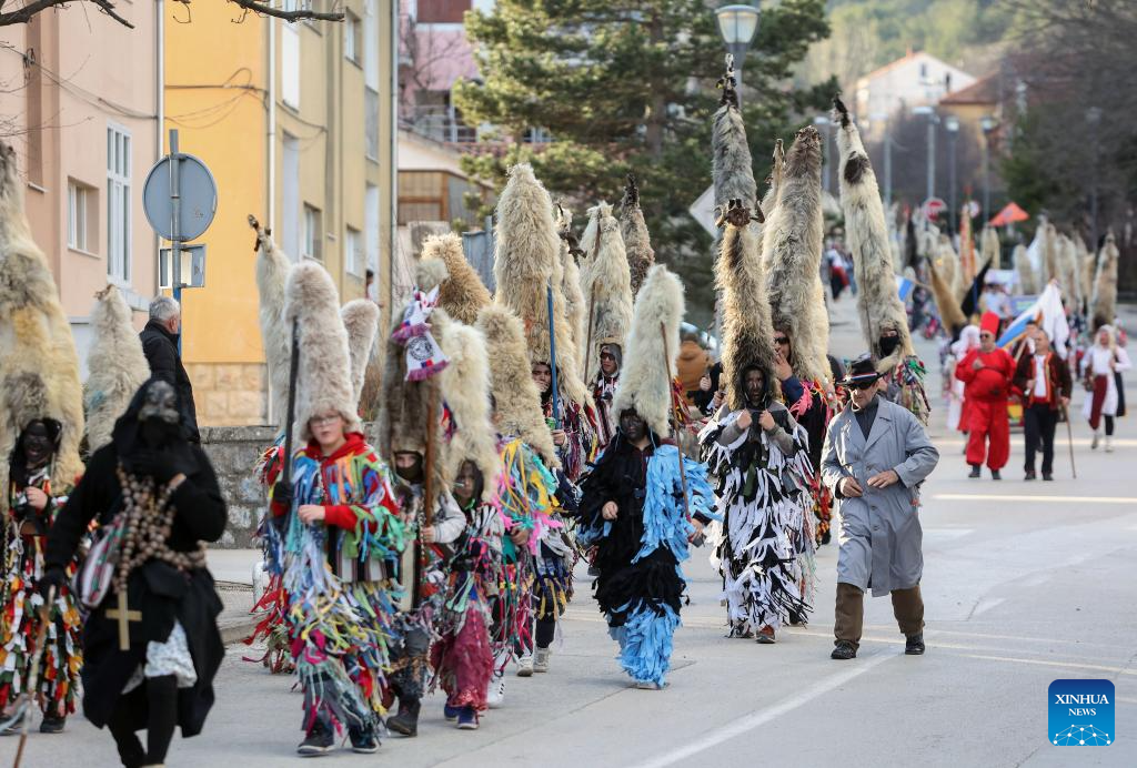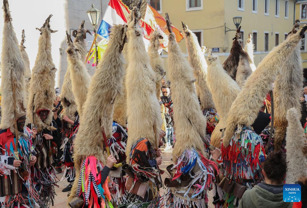 Bell ringers, wearing old clothes with colorful fringes and sheep fleeces up to 1.5 meters high on their heads and bells around their waists, participate in a carnival parade in Sinj, Croatia, on Feb. 13, 2024. (Ivana Ivanovic/PIXSELL via Xinhua)