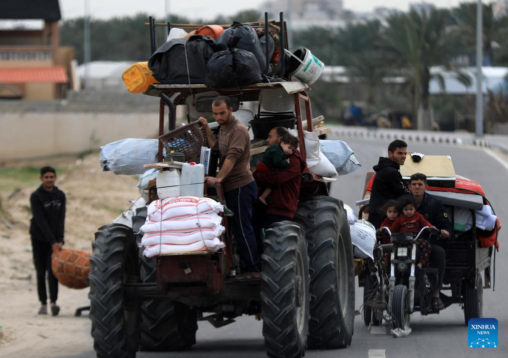 People leave their home after Israeli bombings in the southern Gaza Strip city of Rafah, on Feb. 13, 2024. On Tuesday, the Hamas-run Health Ministry announced that the Israeli military killed 133 Palestinians and wounded 162 others in the Gaza Strip during the past 24 hours. This brings the total number of deaths to 28,473 and injuries to 68,146 in the Palestinian enclave since the Israel-Hamas conflict broke out on Oct. 7, 2023, the ministry said in a press statement. (Photo by Yasser Qudih/Xinhua)