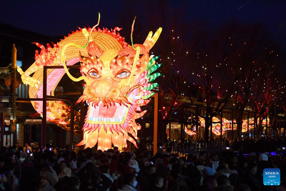 People look at a giant dragon-shaped lantern at a fair in Xicheng District of Beijing, capital of China, Feb. 14, 2024. People across China are enjoying the ongoing Spring Festival holiday in various ways. (Xinhua/Ju Huanzong)