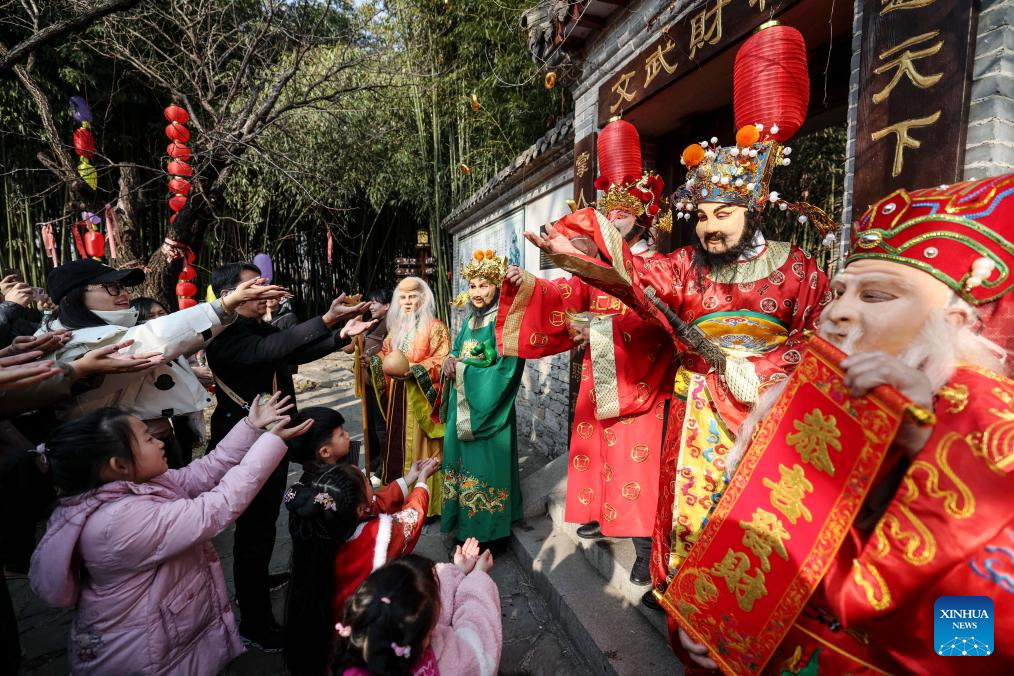 Staff members in the costume of the God of Wealth interact with tourists in Zhuquan Village of Linyi City, east China's Shandong Province, Feb. 14, 2024.