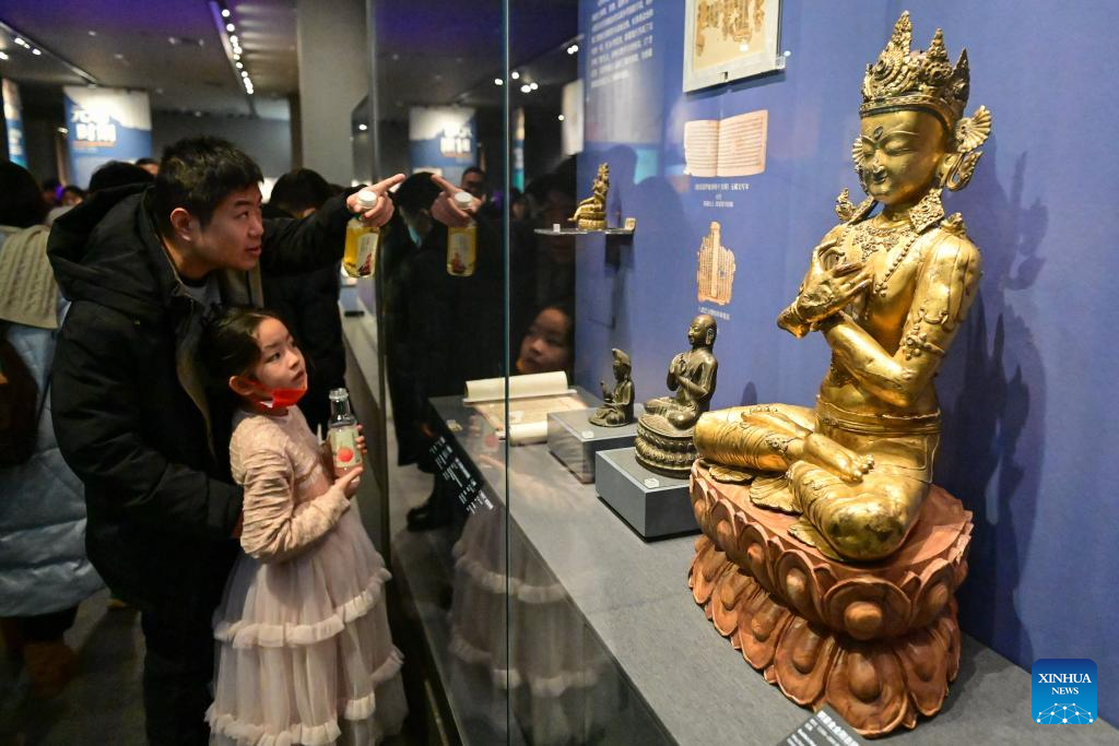 Visitors view exhibits at a museum in Urumqi, capital of northwest China's Xinjiang Uygur Autonomous Region, Feb. 14, 2024. Many people choose to spend their Spring Festival holiday by viewing exhibitions in museums. (Xinhua/Ding Lei)