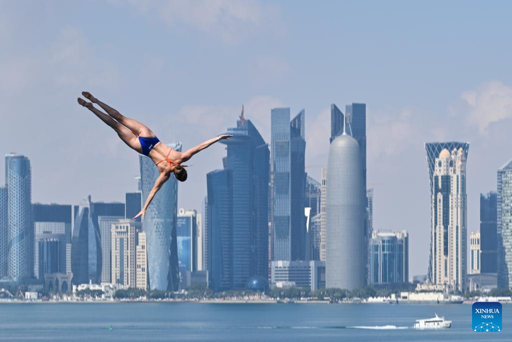 Ginni Van Katwijk of the Netherlands competes during the women's 20m final of high diving event at the World Aquatics Championships 2024 in Doha, Qatar, Feb. 14, 2024. (Xinhua/Du Yu)