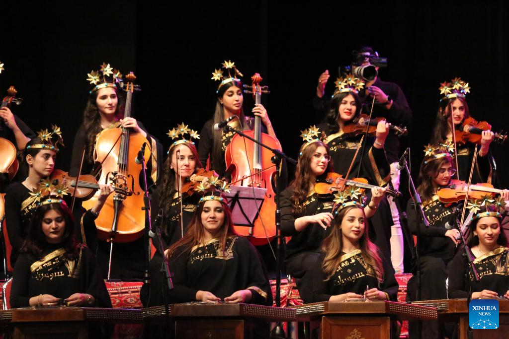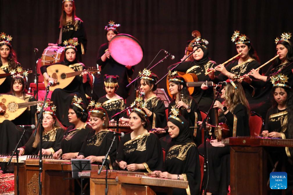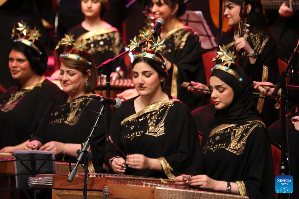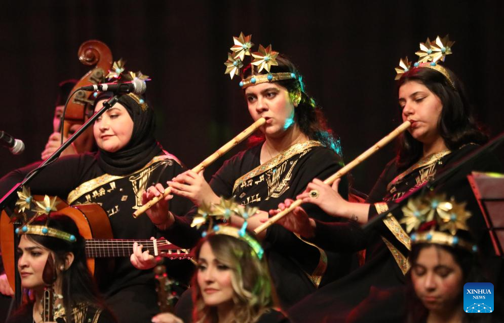 Female musicians from Sumeryat Music Ensemble perform Iraqi folk music and songs at the Iraqi National Theater in Baghdad, Iraq, on Feb. 17, 2024. (Xinhua/Khalil Dawood)