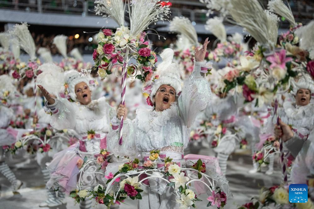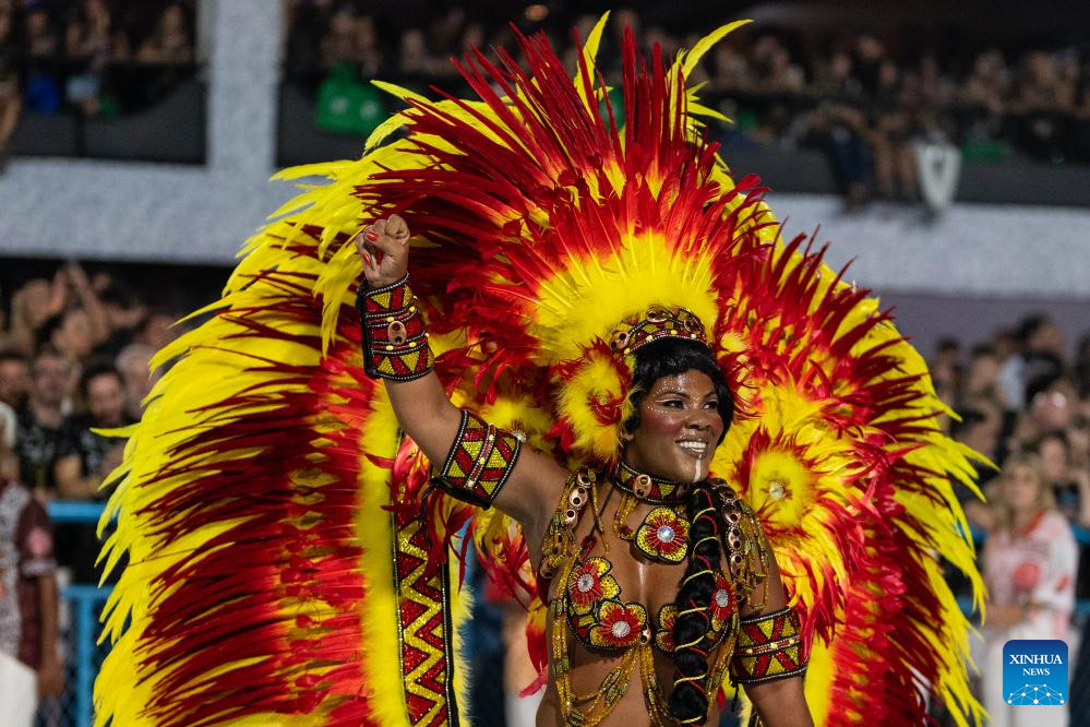 Revelers participate in the carnival parade in Rio de Janeiro, Brazil, on Feb. 18, 2024. (Xinhua/Wang Tiancong)