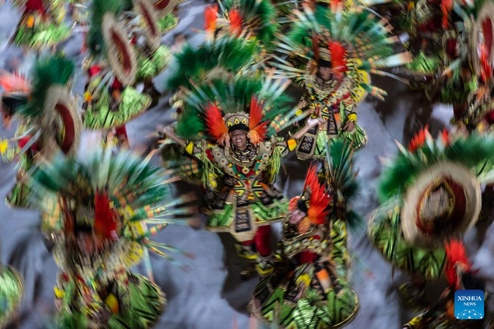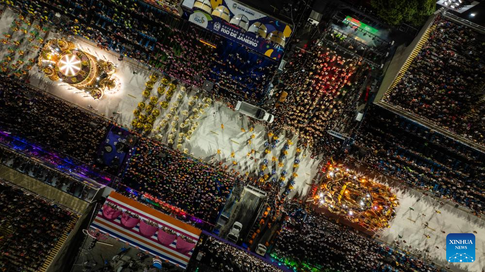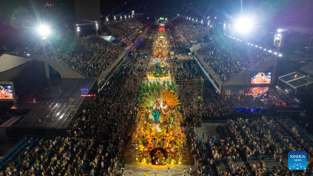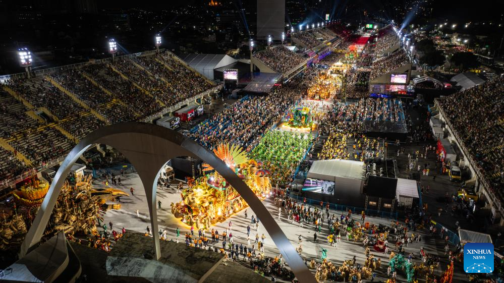An aerial drone photo taken on Feb. 18, 2024 shows actors participating in the carnival parade on the Marques De Sapucai Avenue in Rio de Janeiro, Brazil. (Xinhua/Wang Tiancong)