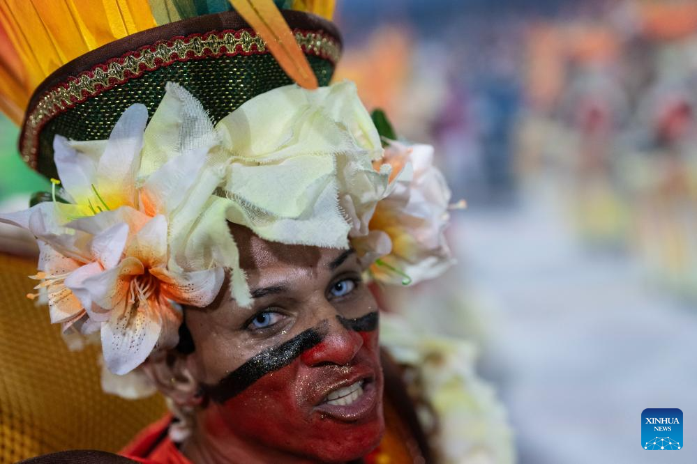A reveler participates in the carnival parade in Rio de Janeiro, Brazil, on Feb. 18, 2024. (Xinhua/Wang Tiancong)