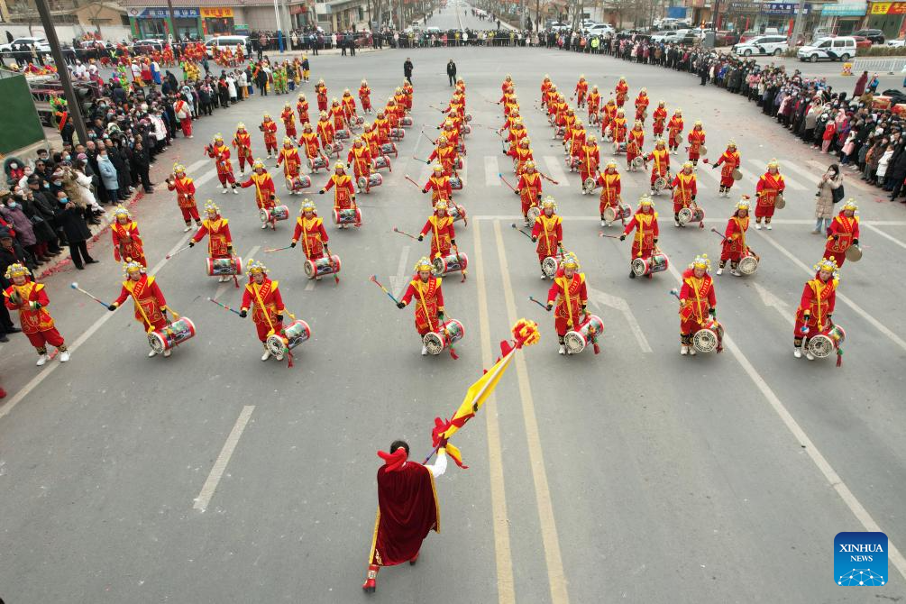 An aerial drone photo taken on Feb. 20, 2024 shows performers playing drums during a Shehuo show in Yuzhong County of Lanzhou, northwest China's Gansu Province. Shehuo, a traditional folk celebration in China, is a festivity in multiple forms consisting of dragon dance, lion dance, traditional Chinese opera, drum playing and other folk performances that may vary in different regions. (Xinhua/Fan Peishen)