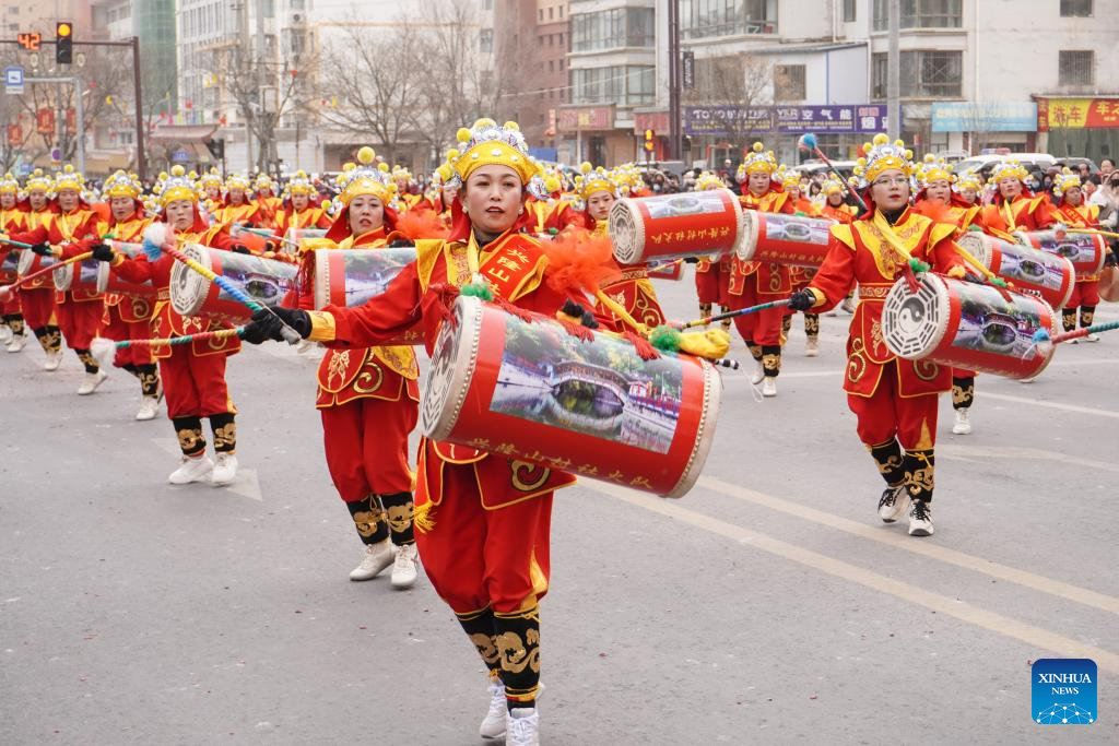 Performers play drums during a Shehuo show in Yuzhong County of Lanzhou, northwest China's Gansu Province, Feb. 20, 2024. Shehuo, a traditional folk celebration in China, is a festivity in multiple forms consisting of dragon dance, lion dance, traditional Chinese opera, drum playing and other folk performances that may vary in different regions. (Xinhua/Fan Peishen)