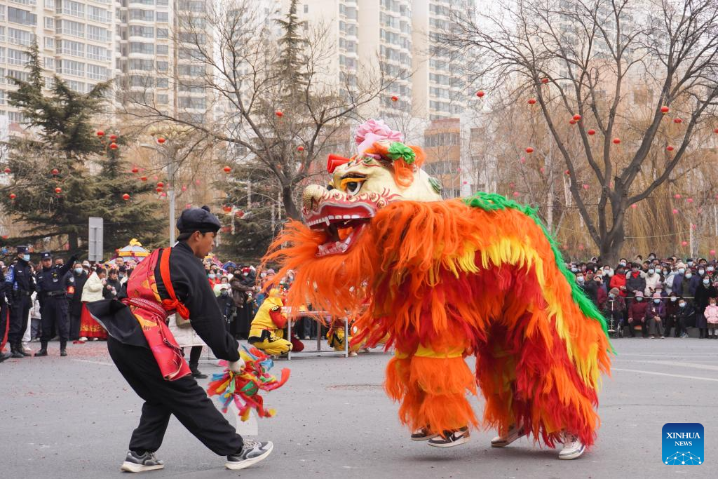Performers perform lion dance during a Shehuo show in Yuzhong County of Lanzhou, northwest China's Gansu Province, Feb. 20, 2024. Shehuo, a traditional folk celebration in China, is a festivity in multiple forms consisting of dragon dance, lion dance, traditional Chinese opera, drum playing and other folk performances that may vary in different regions. (Xinhua/Ma Xiping)