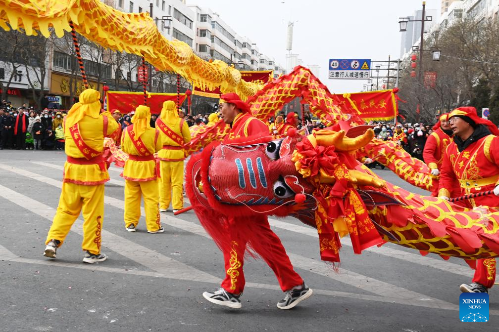 Dragon dancers perform during a Shehuo show in Yuzhong County of Lanzhou, northwest China's Gansu Province, Feb. 20, 2024. Shehuo, a traditional folk celebration in China, is a festivity in multiple forms consisting of dragon dance, lion dance, traditional Chinese opera, drum playing and other folk performances that may vary in different regions. (Xinhua/Fan Peishen)