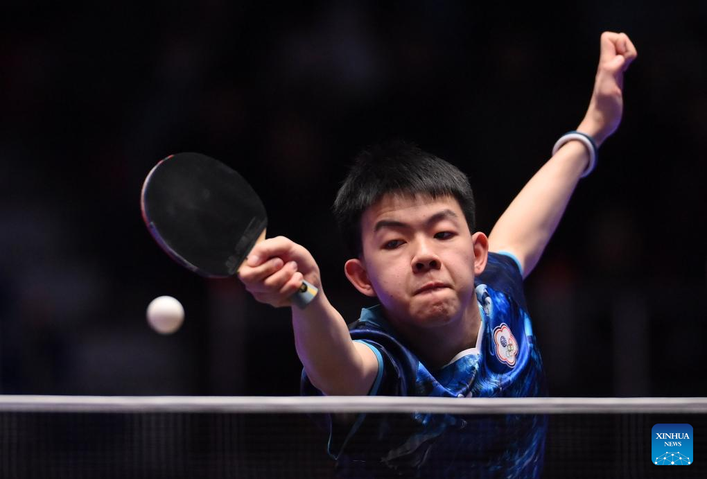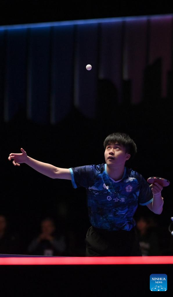Kao Cheng-Jui of Chinese Taipei returns the ball to Patrick Franziska of Germany during the men's team quarterfinal at the ITTF World Team Table Tennis Championships Finals Busan 2024 in Busan, South Korea, Feb. 23, 2024. (Xinhua/Tao Xiyi)
