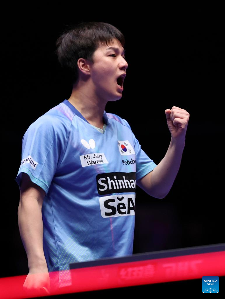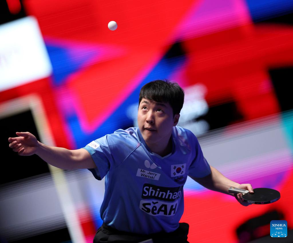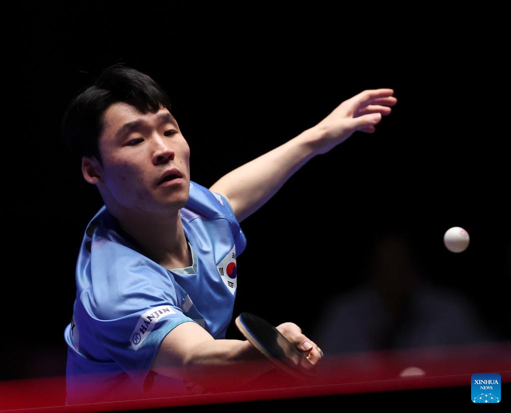 Lim Jonghoon of South Korea returns the ball to Denmark's Jonathan Groth during the men's team quarterfinal match between South Korea and Denmark at the ITTF World Team Table Tennis Championships Finals Busan 2024 in Busan, South Korea, Feb. 23, 2024. (Xinhua/Yao Qilin)