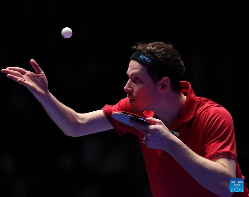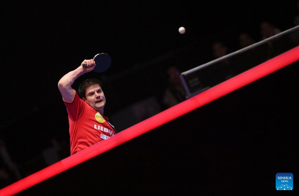 Dimitrij Ovtcharova of Germany returns the ball to Lin Yun-Ju of Chinese Taipei during the men's team quarterfinal at the ITTF World Team Table Tennis Championships Finals Busan 2024 in Busan, South Korea, Feb. 23, 2024. (Xinhua/Tao Xiyi)