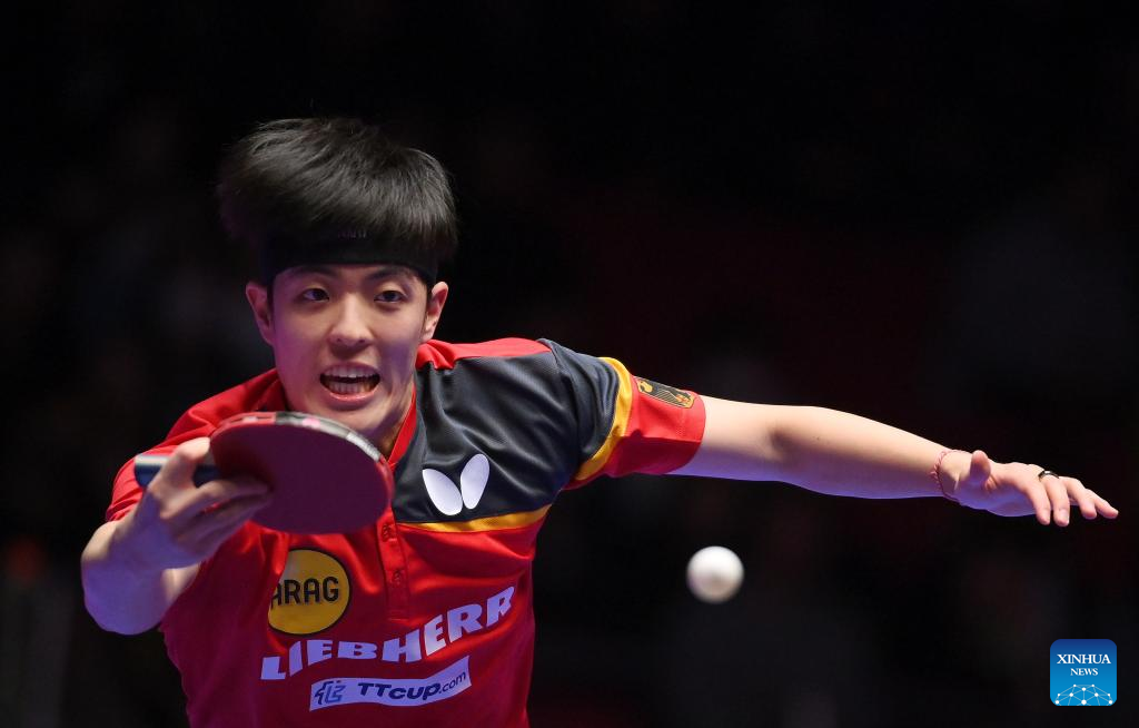 Qiu Dang of Germany returns the ball to Chuang Chih-Yuan of Chinese Taipei during the men's team quarterfinal at the ITTF World Team Table Tennis Championships Finals Busan 2024 in Busan, South Korea, Feb. 23, 2024. (Xinhua/Tao Xiyi)