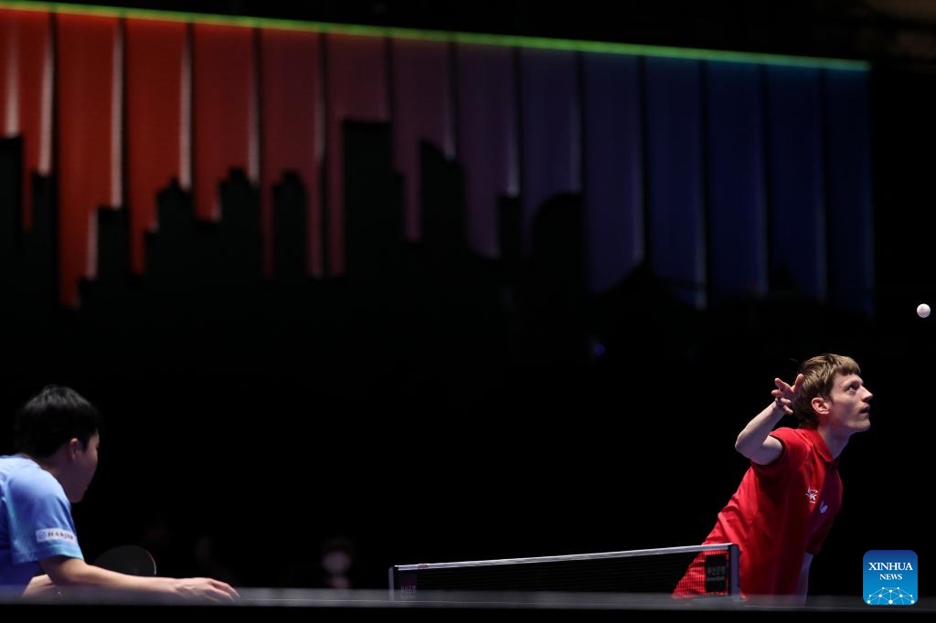 Denmark's Jonathan Groth serves the ball to Lim Jonghoon of South Korea during the men's team quarterfinal match between South Korea and Denmark at the ITTF World Team Table Tennis Championships Finals Busan 2024 in Busan, South Korea, Feb. 23, 2024. (Xinhua/Yao Qilin)