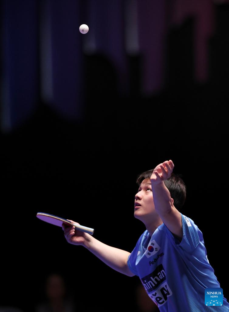 Lim Jonghoon of South Korea serves the ball to Denmark's Jonathan Groth during the men's team quarterfinal match between South Korea and Denmark at the ITTF World Team Table Tennis Championships Finals Busan 2024 in Busan, South Korea, Feb. 23, 2024. (Xinhua/Yao Qilin)
