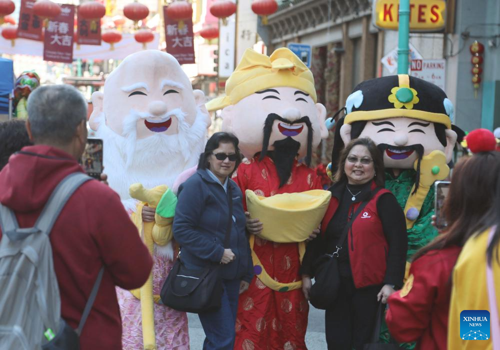 People pose for photos in celebration of the Lantern Festival at the Chinatown in San Francisco, the United States, Feb. 24, 2024. (Photo by Liu Yilin/Xinhua)