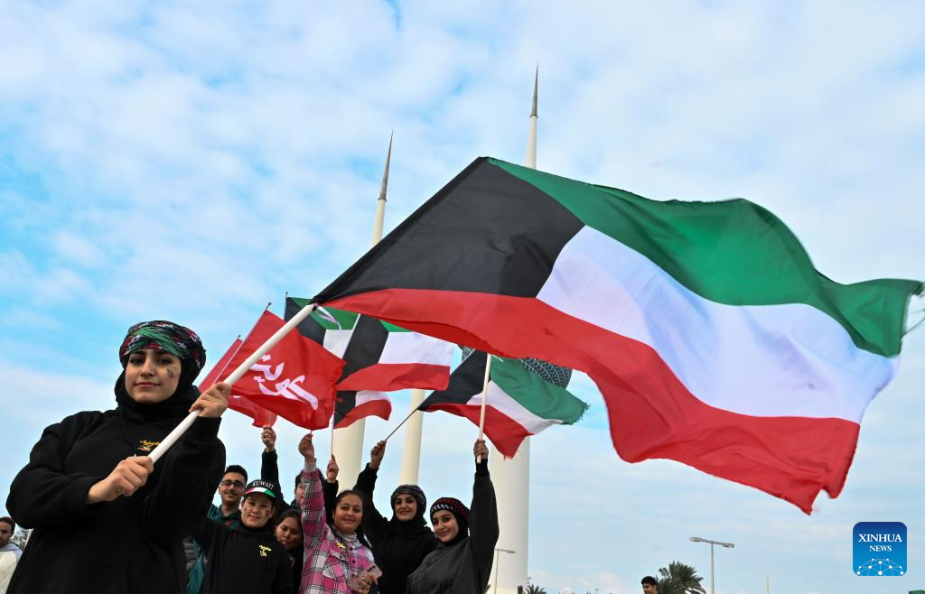 People carry Kuwait's national flags during the celebration in Capital Governorate, Kuwait, Feb. 25, 2024. Kuwaitis celebrate their national and liberation days on Feb. 25 and 26 every year. (Photo by Asad/Xinhua)