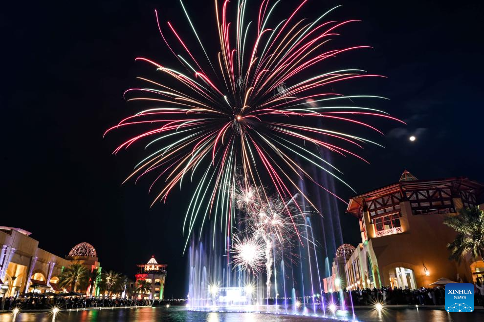 Fireworks are seen during the celebration in Ahmadi Governorate, Kuwait, Feb. 25, 2024. Kuwaitis celebrate their national and liberation days on Feb. 25 and 26 every year. (Photo by Asad/Xinhua)
