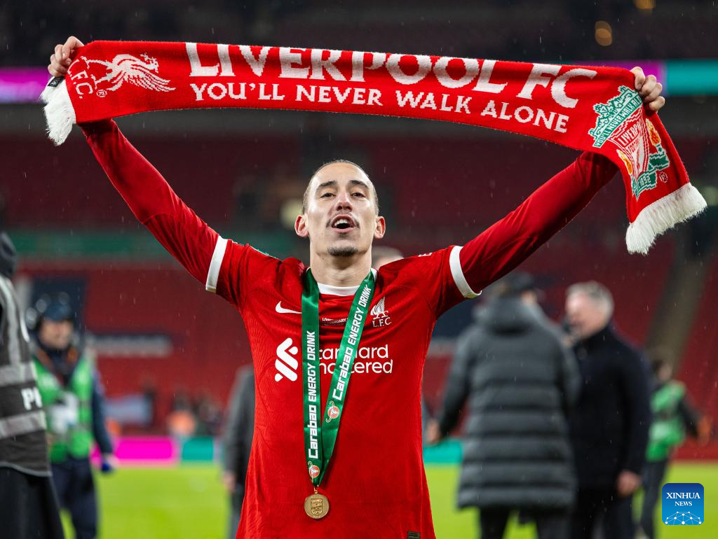 Liverpool's Alexis Mac Allister (1st, L) and Andy Robertson (2nd, L) celebrate with the trophy after the English Football League Cup final match between Chelsea and Liverpool in London, Britain, on Feb. 25, 2024. (Xinhua)