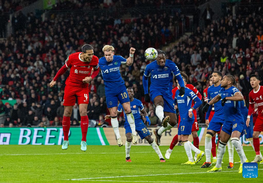 Liverpool's captain Virgil Van Dijk (1st L) scores the winning goal in extra-time during the English Football League Cup final match between Chelsea and Liverpool in London, Britain, on Feb. 25, 2024. (Xinhua)