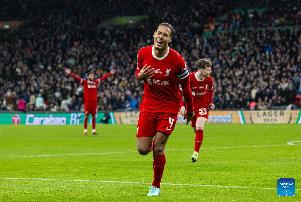 Liverpool's captain Virgil Van Dijk celebrates after scoring the winning goal in extra-time during the English Football League Cup final match between Chelsea and Liverpool in London, Britain, on Feb. 25, 2024. (Xinhua)