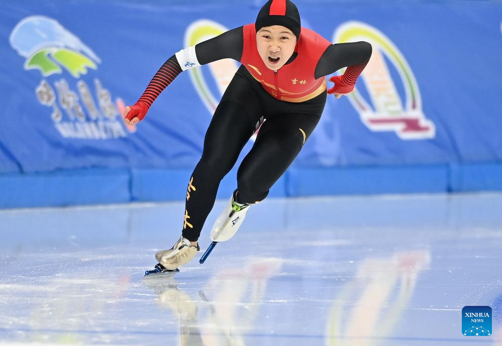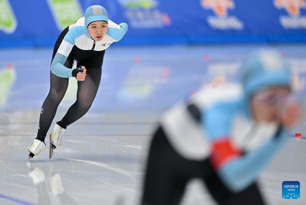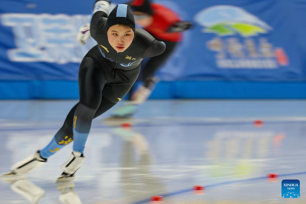 Zou Xinyue of Jilin competes during the junior women's 500m A final of speed skating event at the China's 14th National Winter Games in Hulun Buir, north China's Inner Mongolia Autonomous Region, Feb. 26, 2024. (Xinhua/Yang Chenguang)