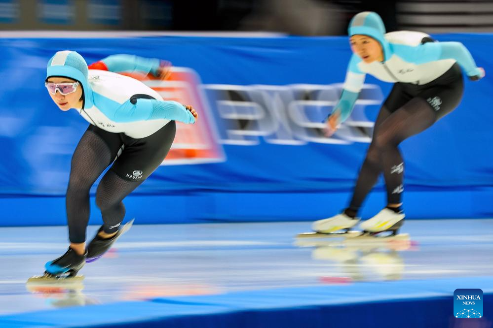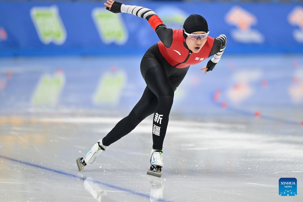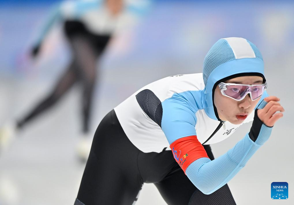 Wang Yingying of Xinjiang competes during the junior women's 500m A final of speed skating event at the China's 14th National Winter Games in Hulun Buir, north China's Inner Mongolia Autonomous Region, Feb. 26, 2024. (Xinhua/Yang Chenguang)