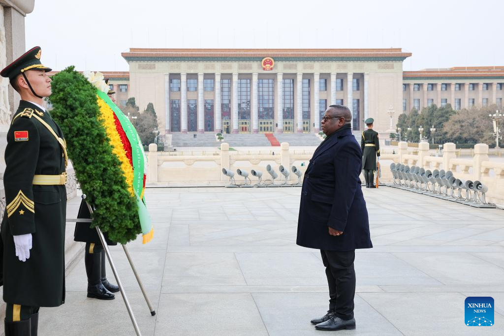 Sierra Leonean President Julius Maada Bio lays a wreath at the Monument to the People's Heroes on the Tian'anmen Square in Beijing, capital of China, Feb. 28, 2024. (Xinhua/Liu Bin)