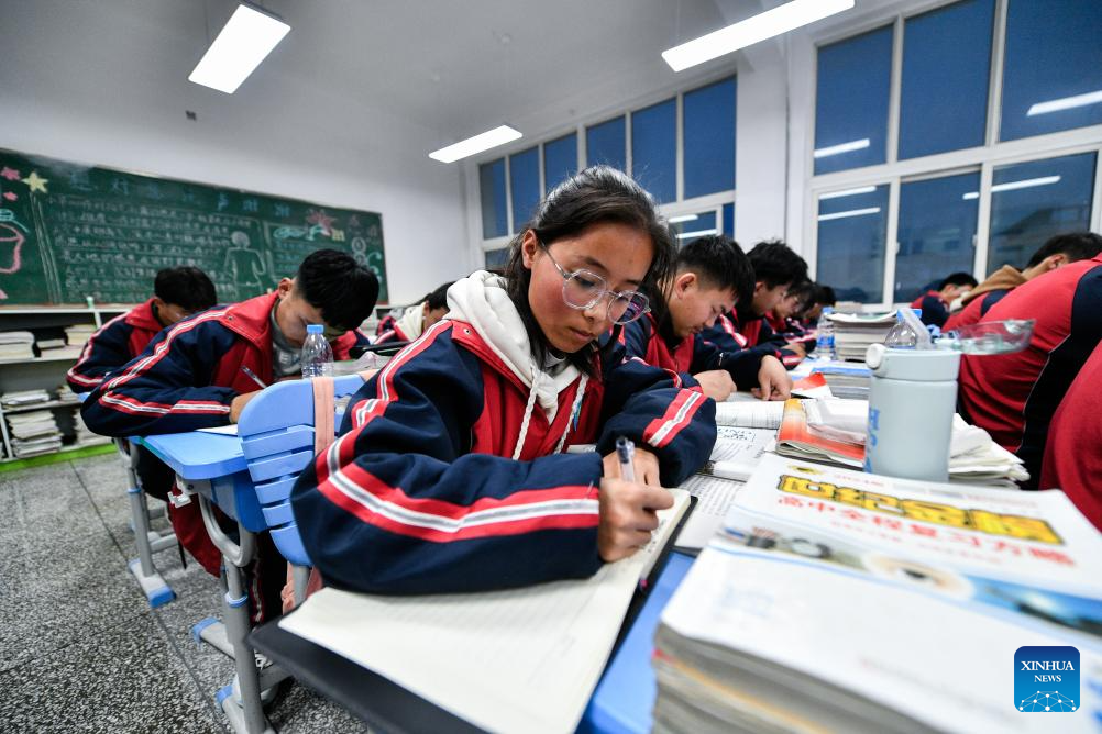 Students study at Jishi Middle School in Jishishan County, northwest China's Gansu Province, Feb. 26, 2024. Primary and secondary schools in Jishishan started new semester on Monday. The reinforcement projects at the schools in Jishishan have been completed after a 6.2-magnitude earthquake struck it on Dec. 18, 2023. (Xinhua/Lang Bingbing)