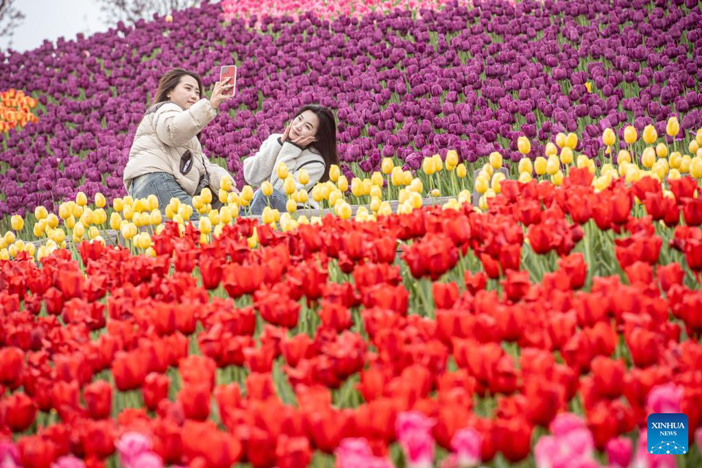 Visitors take pictures with blooming tulips at a scenic area in southwest China's Chongqing, Feb. 27, 2024. (Xinhua/Tang Yi)