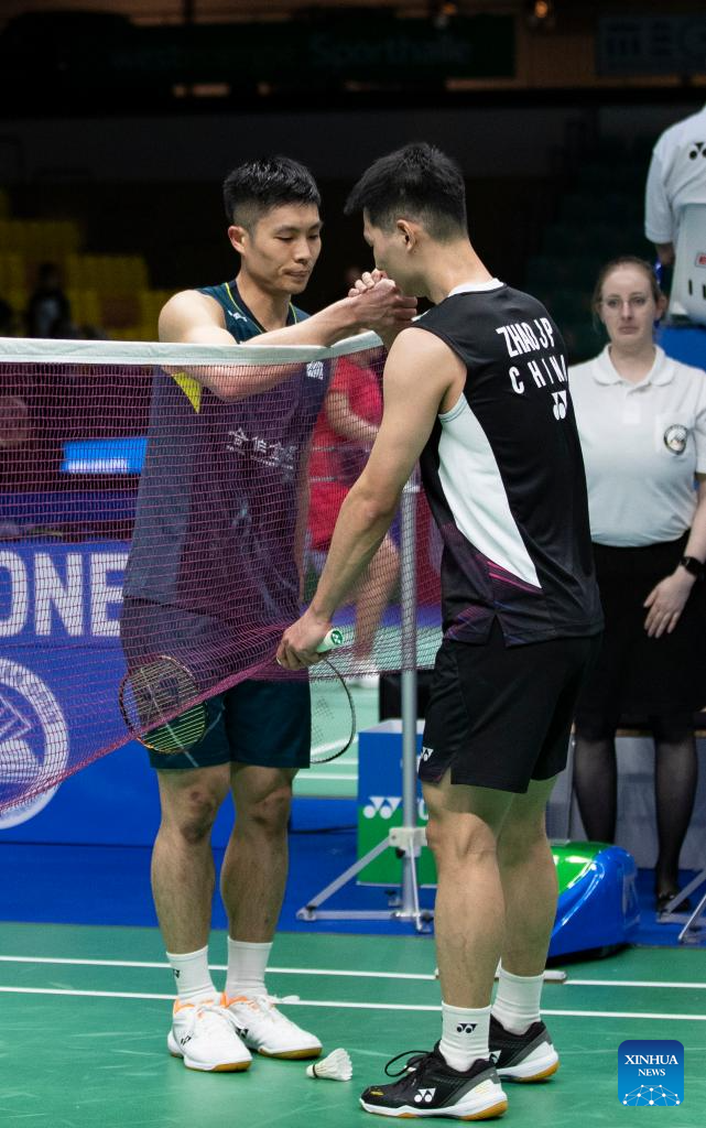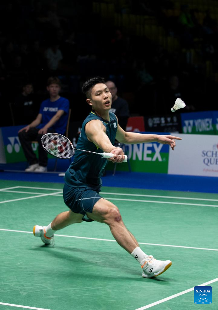 Chou Tien Chen of Chinese Taipei returns the shuttlecock to Zhao Junpeng of China during the men's singles second round match at Yonex German Open 2024 badminton tournament in Muelheim, Germany, Feb. 29, 2024. (Xinhua/Zhang Fan)