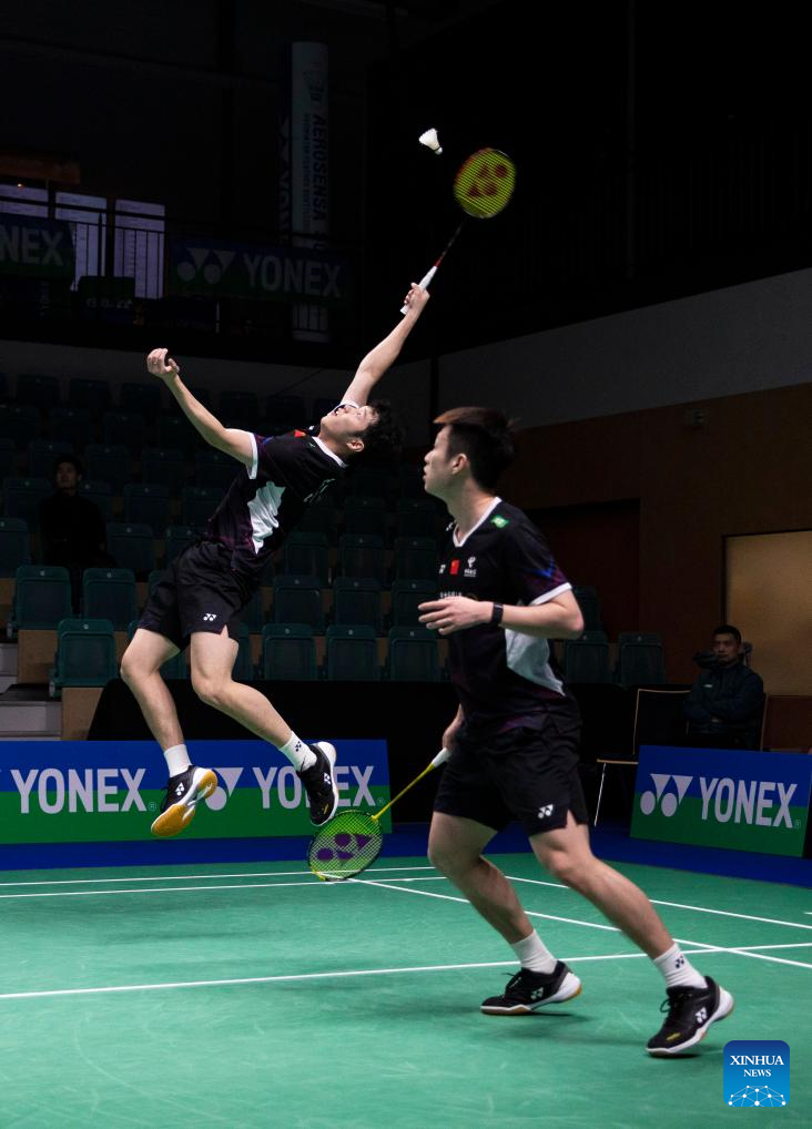 He Jiting (below, 2nd R)/Ren Xiangyu (below, 1st R) of China compete against Job Castillo/Luis Armando Montoya Navarro of Mexico during the men's doubles second round match at Yonex German Open 2024 badminton tournament in Muelheim, Germany, Feb 29, 2024. (Xinhua/Zhang Fan)
