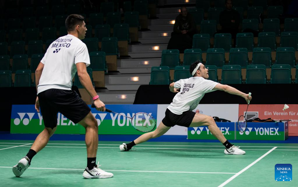 Job Castillo (R)/Luis Armando Montoya Navarro of Mexico compete against He Jiting/Ren Xiangyu of China during the men's doubles second round match at Yonex German Open 2024 badminton tournament in Muelheim, Germany, Feb 29, 2024. (Xinhua/Zhang Fan)