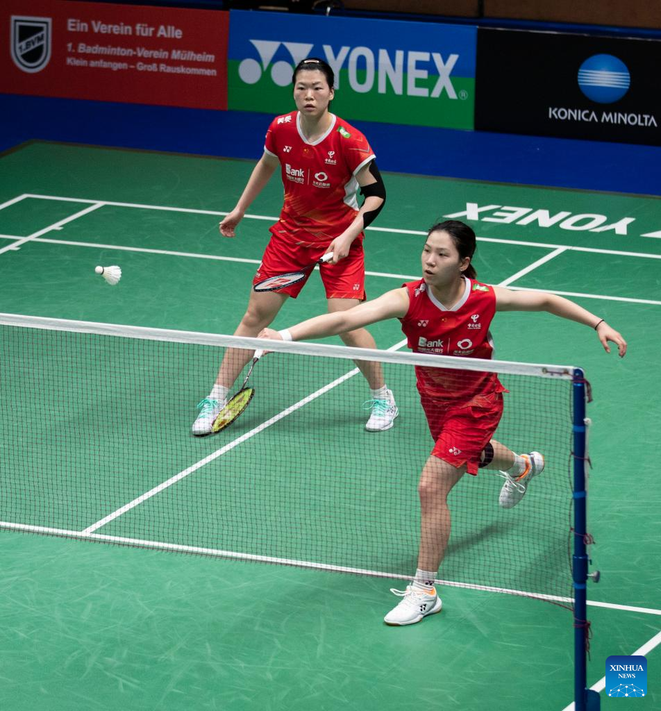 Li Yijing (L)/Luo Xumin of China compete against Francesca Corbett/Allison Lee of the United States during the women's doubles second round match at Yonex German Open 2024 badminton tournament in Muelheim, Germany, Feb 29, 2024. (Xinhua/Zhang Fan)