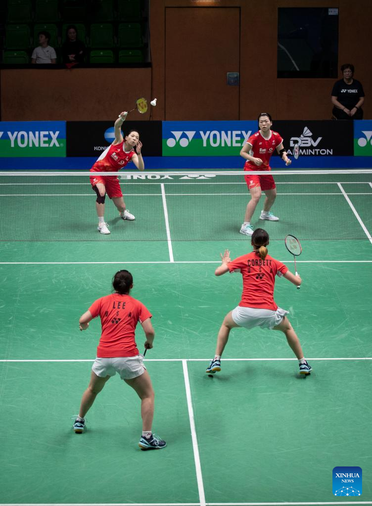 Francesca Corbett/Allison Lee (L) of the United States compete against Li Yijing/Luo Xumin of China during the women's doubles second round match at Yonex German Open 2024 badminton tournament in Muelheim, Germany, Feb 29, 2024. (Xinhua/Zhang Fan)