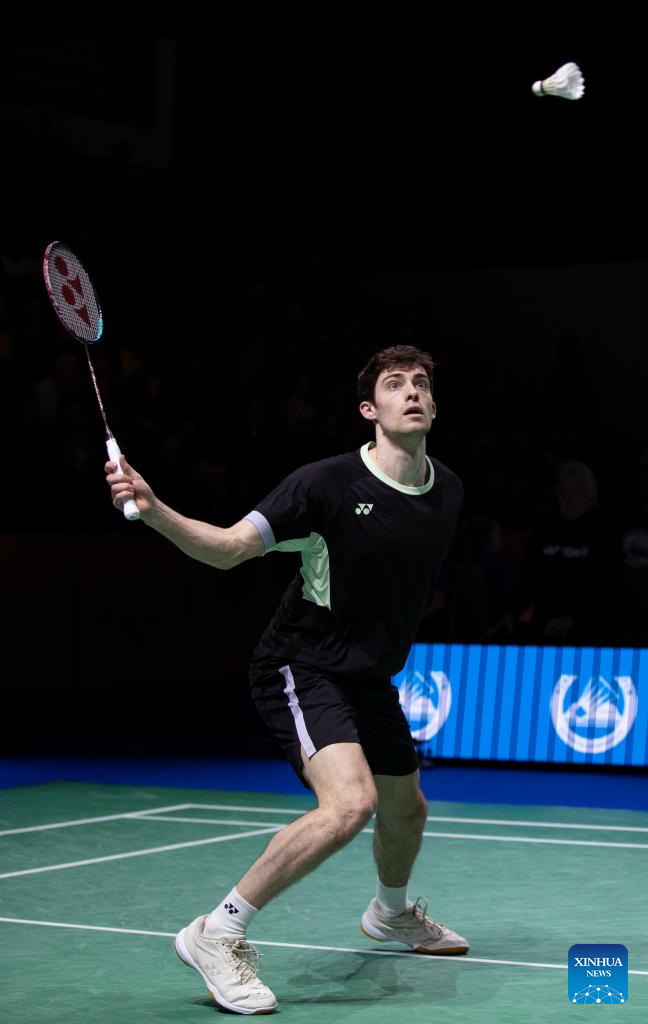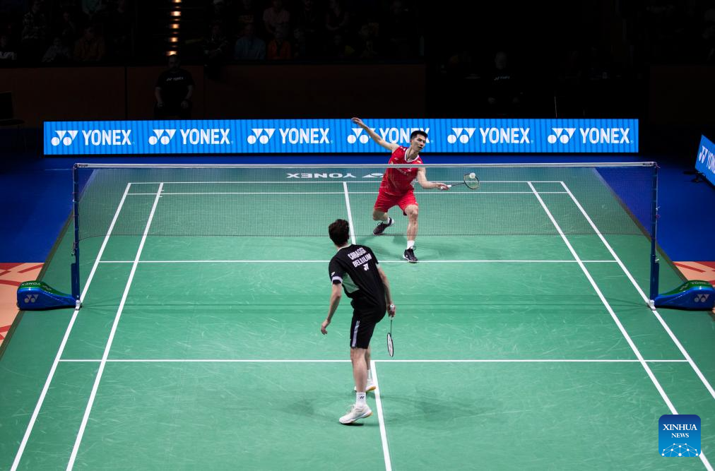 Julien Carraggi of Belgium returns the shuttlecock to Zhao Junpeng of China during the men's singles quarterfinal match at Yonex German Open 2024 badminton tournament in Muelheim, Germany, March 1, 2024. (Xinhua/Zhang Fan)