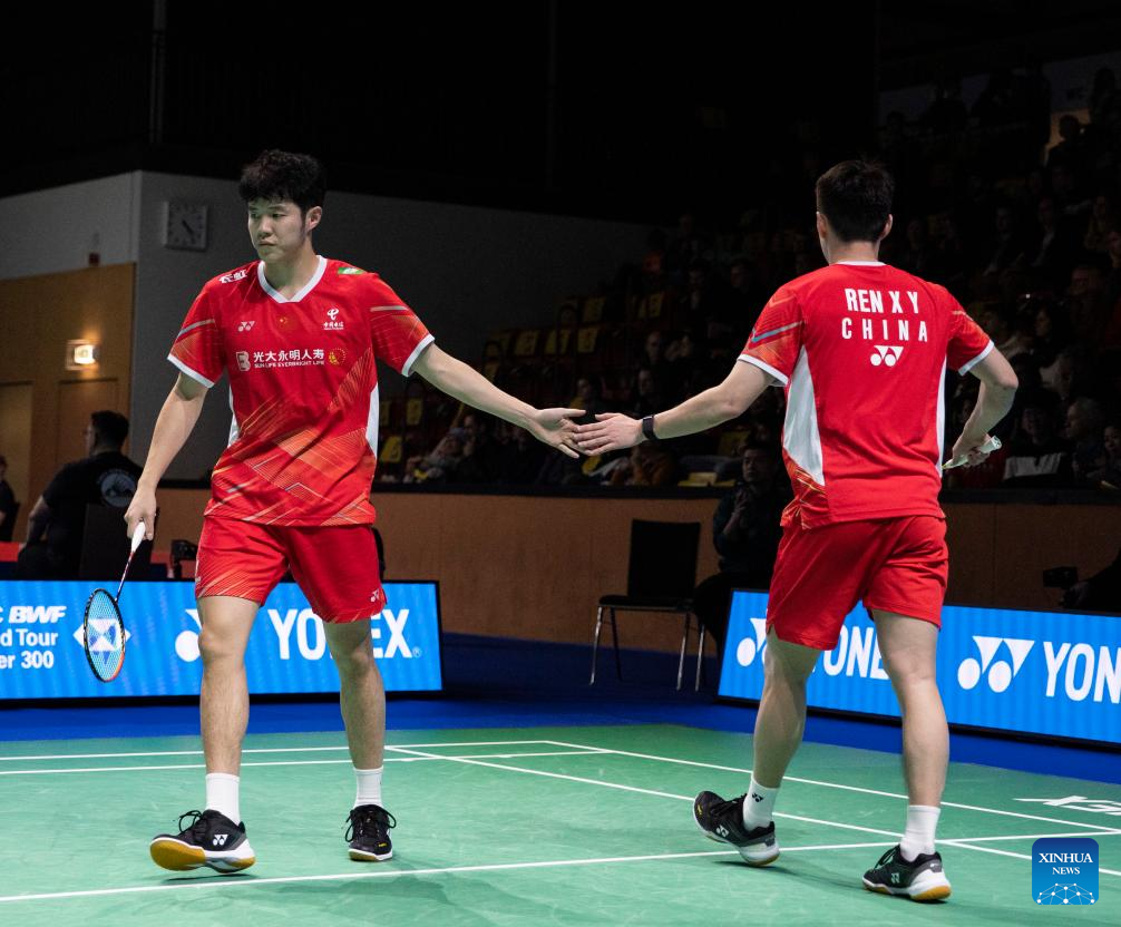 He Jiting (R,top)/Ren Xiangyu (L,top) of China compete during the men's doubles quarterfinal match against Mark Lamsfuss/Marvin Seidel of Germany at Yonex German Open 2024 badminton tournament in Muelheim, Germany, March 1, 2024. (Xinhua/Zhang Fan)