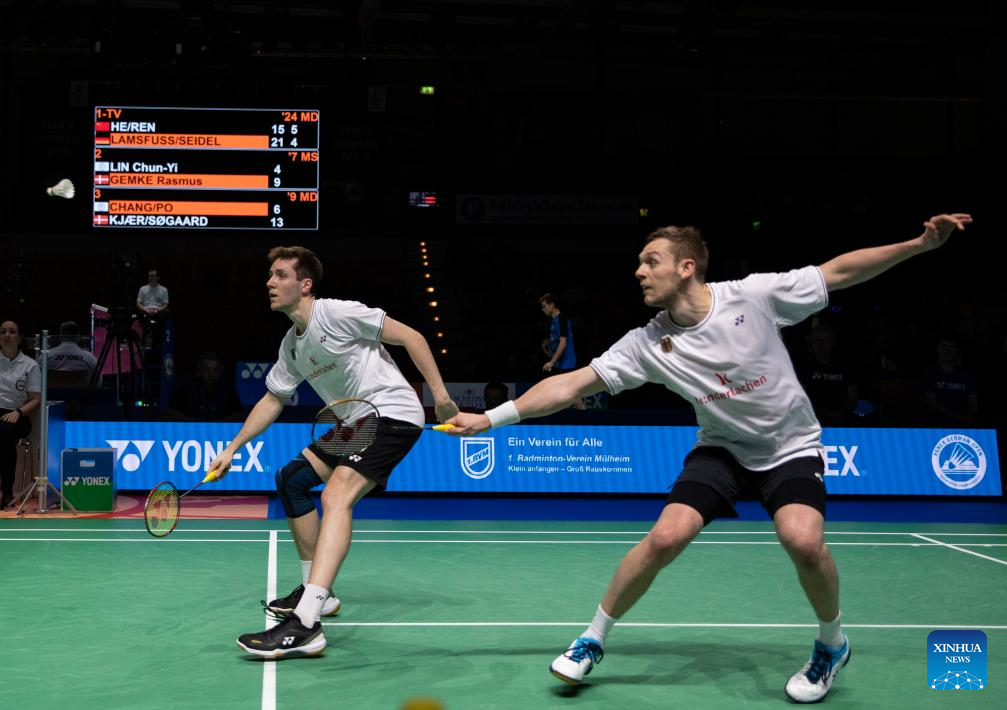 Mark Lamsfuss/Marvin Seidel (R) of Germany compete during the men's doubles quarterfinal match against He Jiting/Ren Xiangyu of China at Yonex German Open 2024 badminton tournament in Muelheim, Germany, March 1, 2024. (Xinhua/Zhang Fan)