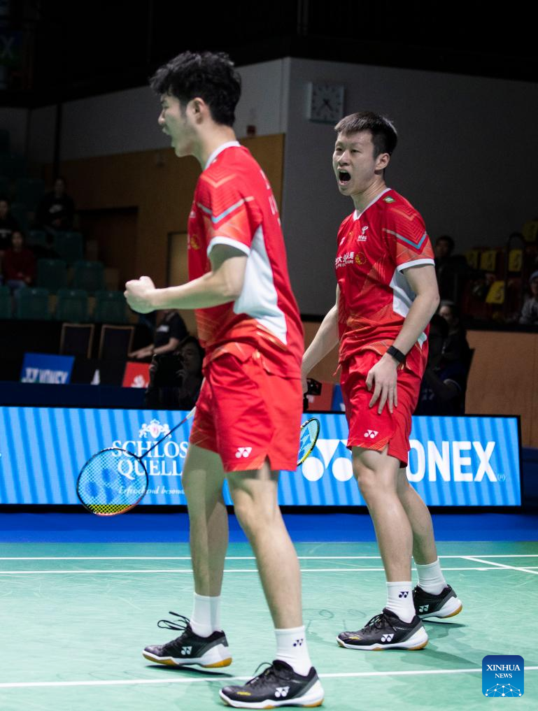 He Jiting/Ren Xiangyu (R) of China react during the men's doubles quarterfinal match against Mark Lamsfuss/Marvin Seidel of Germany at Yonex German Open 2024 badminton tournament in Muelheim, Germany, March 1, 2024. (Xinhua/Zhang Fan)