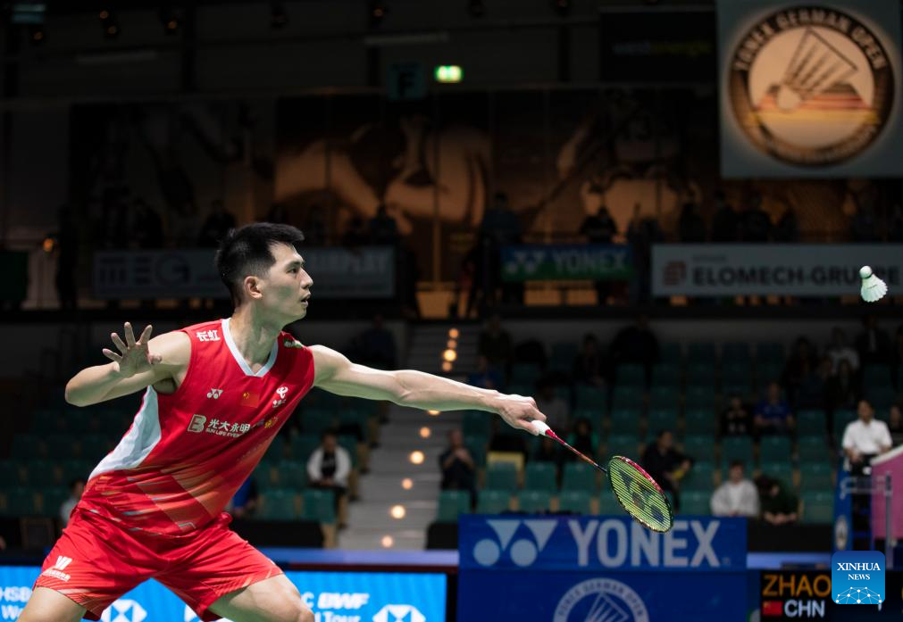 Zhao Junpeng of China returns the shuttlecock to Julien Carraggi of Belgium during the men's singles quarterfinal match at Yonex German Open 2024 badminton tournament in Muelheim, Germany, March 1, 2024. (Xinhua/Zhang Fan)