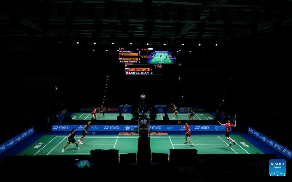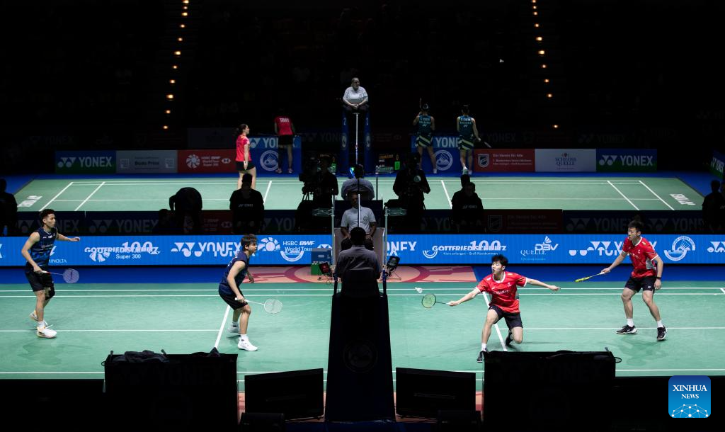 He Jiting(2nd, R)/Ren Xiangyu (1st, R) of China compete during the men's doubles semifinal match against Ong Yew Sin/Teo Ee Yi of Malaysia at Yonex German Open 2024 badminton tournament in Muelheim, Germany, March 2, 2024. (Xinhua/Zhang Fan)