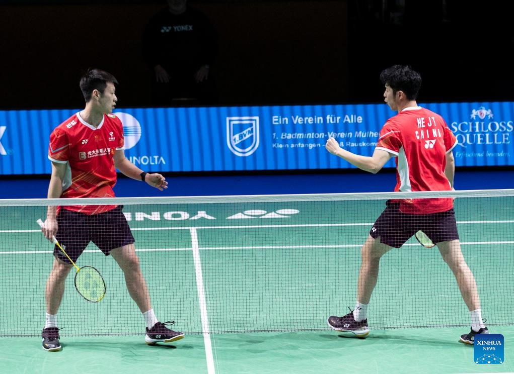 He Jiting/Ren Xiangyu (L) of China celebrate during the men's doubles semifinal match against Ong Yew Sin/Teo Ee Yi of Malaysia at Yonex German Open 2024 badminton tournament in Muelheim, Germany, March 2, 2024. (Xinhua/Zhang Fan)
