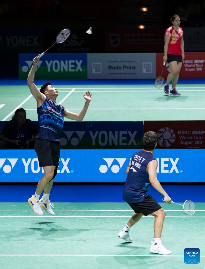Ong Yew Sin (L) /Teo Ee Yi of Malaysia compete during the men's doubles semifinal match against He Jiting/Ren Xiangyu of China at Yonex German Open 2024 badminton tournament in Muelheim, Germany, March 2, 2024. (Xinhua/Zhang Fan)