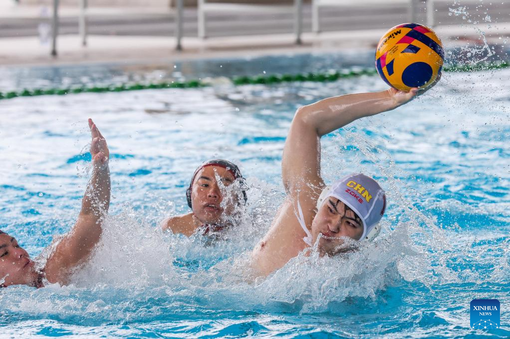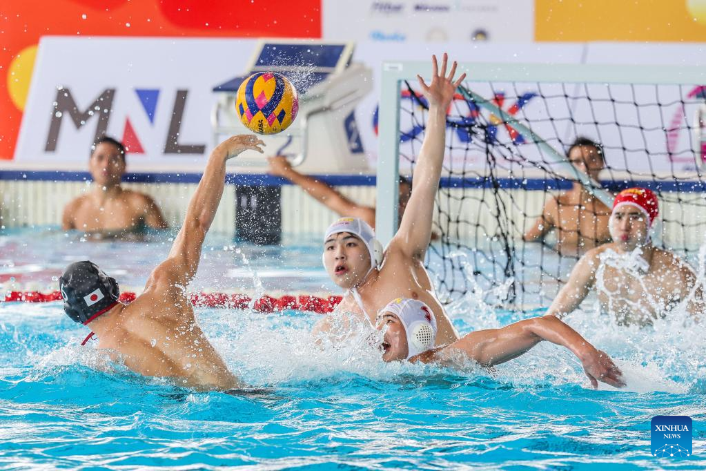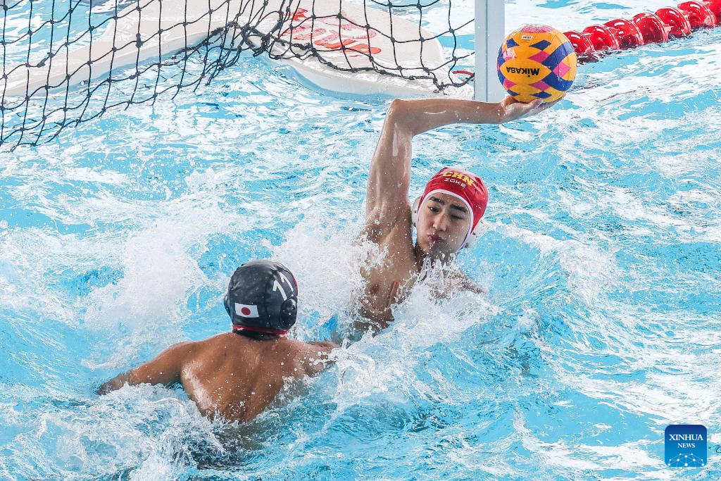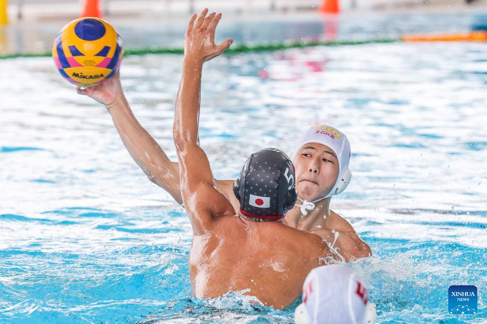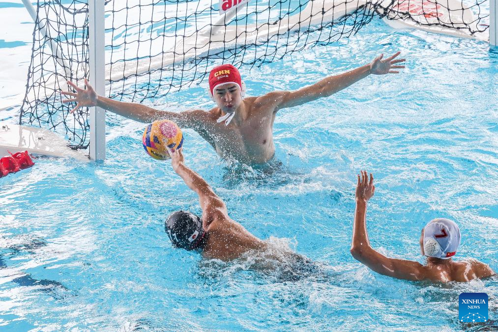Deng Zirui (R) of China vies against players from Japan during the men's water polo round robin Group A match in the 11th Asian Age Group Aquatics Championships in New Clark City, Capas of Tarlac Province, the Philippines, March 3, 2024. (Xinhua/Rouelle Umali)
